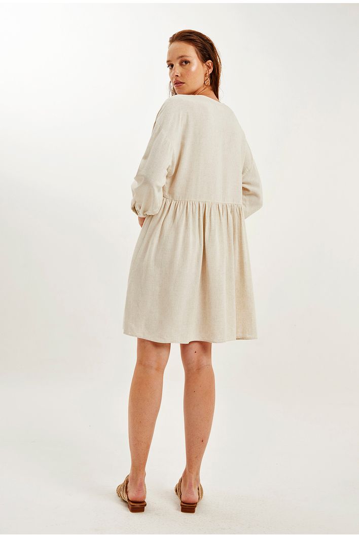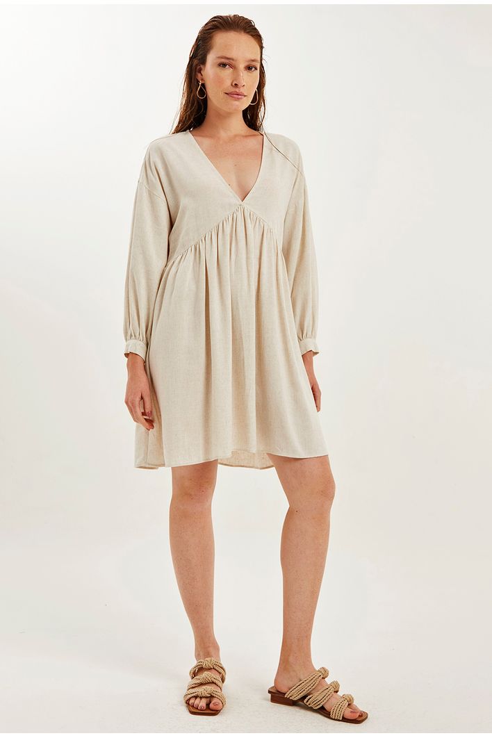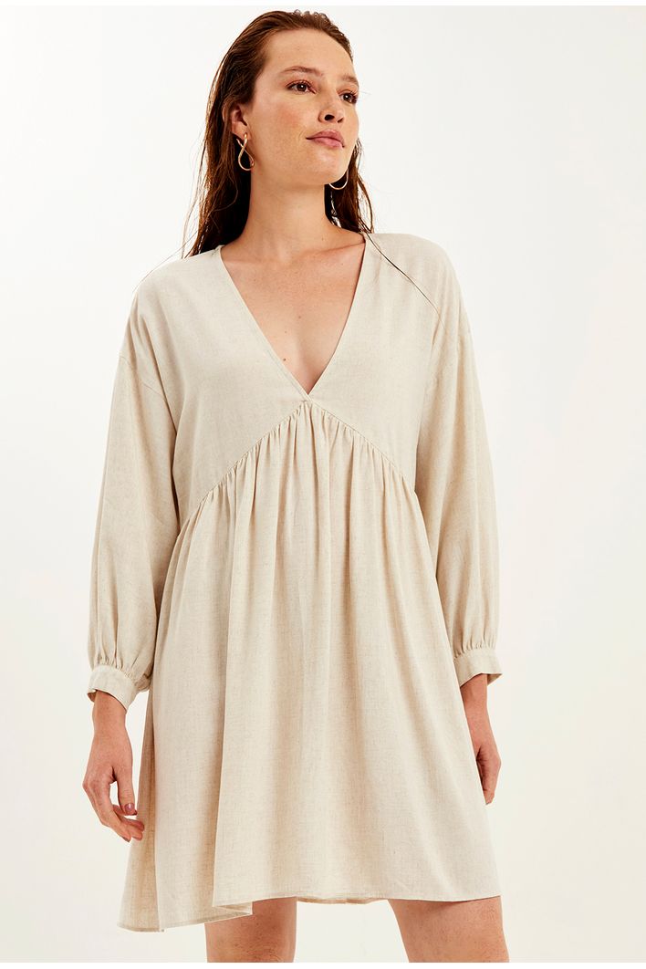O vestido Maupiti possui decote V, mangas bufantes com botão de madrepérola e saia rodada. Sua modelagem é soltinha e seu comprimento curto. Confeccionado em Viscose e Linho, é o vestido perfeito para dias de temperatura amena, fácil de combinar e uma ótima opção para quem ama os basics capazes de atender diversos moods. Para quem deseja um visual mais despojado uma boa pedida é combinar o vestido Maupiti com sobreposições mais larguinhas e para os pés sapatos mais casuais. Já para quem deseja um visual mais sofisticado, que tal um casaquinho com shape mais ajustado e sandálias abertas?