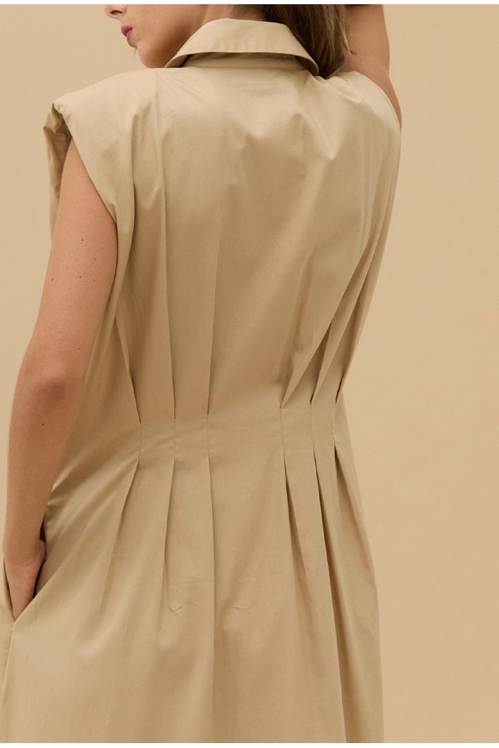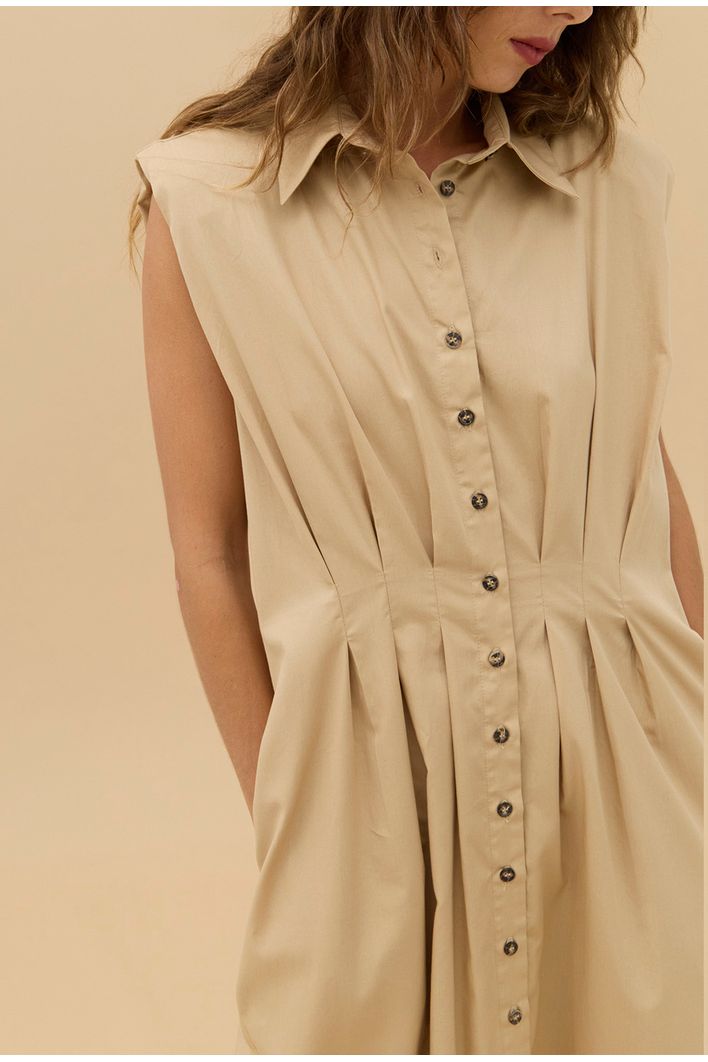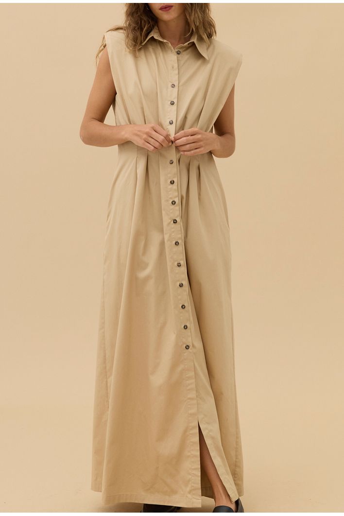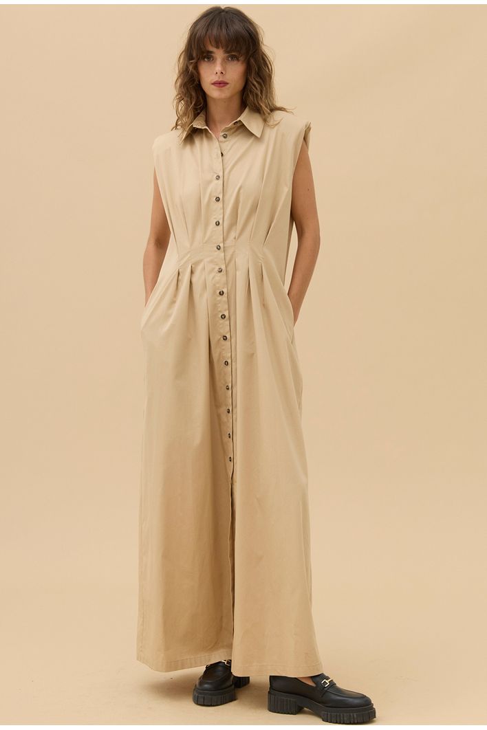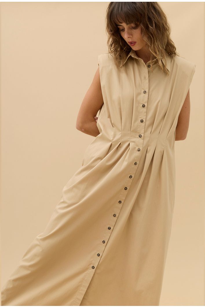 Seu design longo e fluido é complementado por botões frontais em todo o comprimento, permitindo diferentes formas de uso e adicionando um charme sutil à peça. As pregas na área da cintura criam um caimento sofisticado, valorizando a silhueta com um toque de leveza e movimento.