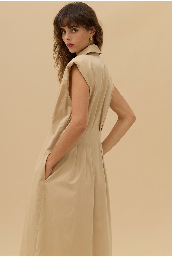 O vestido ainda conta com ombro estruturado, graças às ombreiras acolchoadas removíveis, presas por botões de pressão, permitindo personalização no uso. Já os bolsos laterais garantem praticidade e funcionalidade.