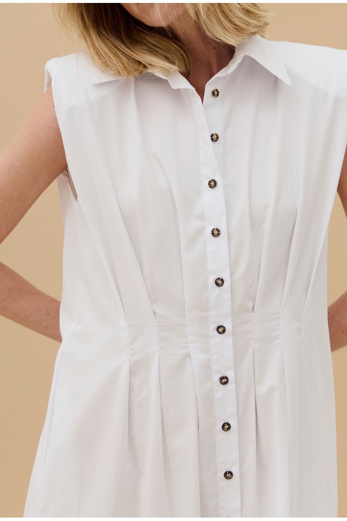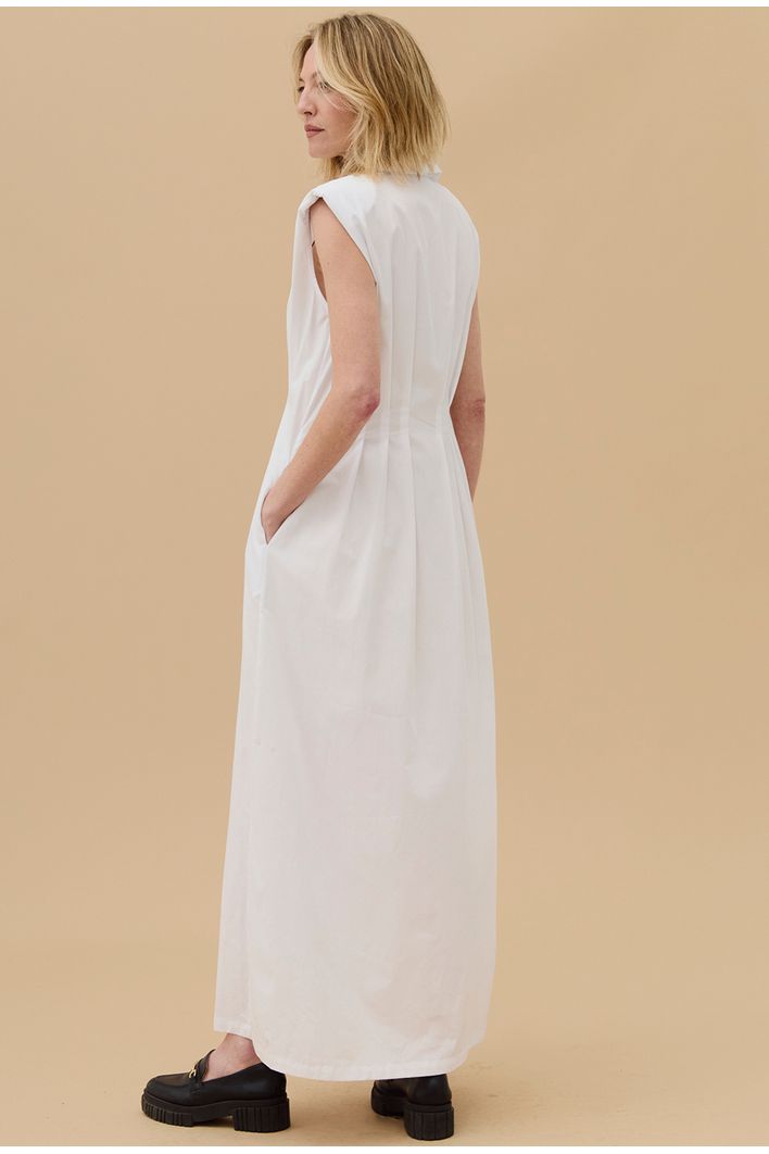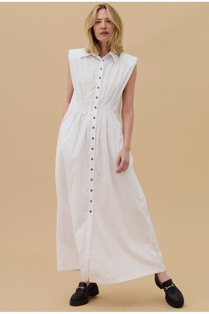 Seu design longo e fluido é complementado por botões frontais em todo o comprimento, permitindo diferentes formas de uso e adicionando um charme sutil à peça. As pregas na área da cintura criam um caimento sofisticado, valorizando a silhueta com um toque de leveza e movimento.