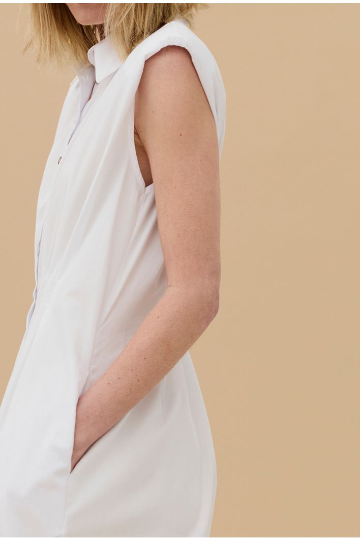 O vestido ainda conta com ombro estruturado, graças às ombreiras acolchoadas removíveis, presas por botões de pressão, permitindo personalização no uso. Já os bolsos laterais garantem praticidade e funcionalidade.