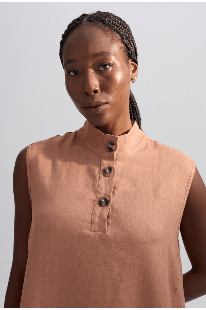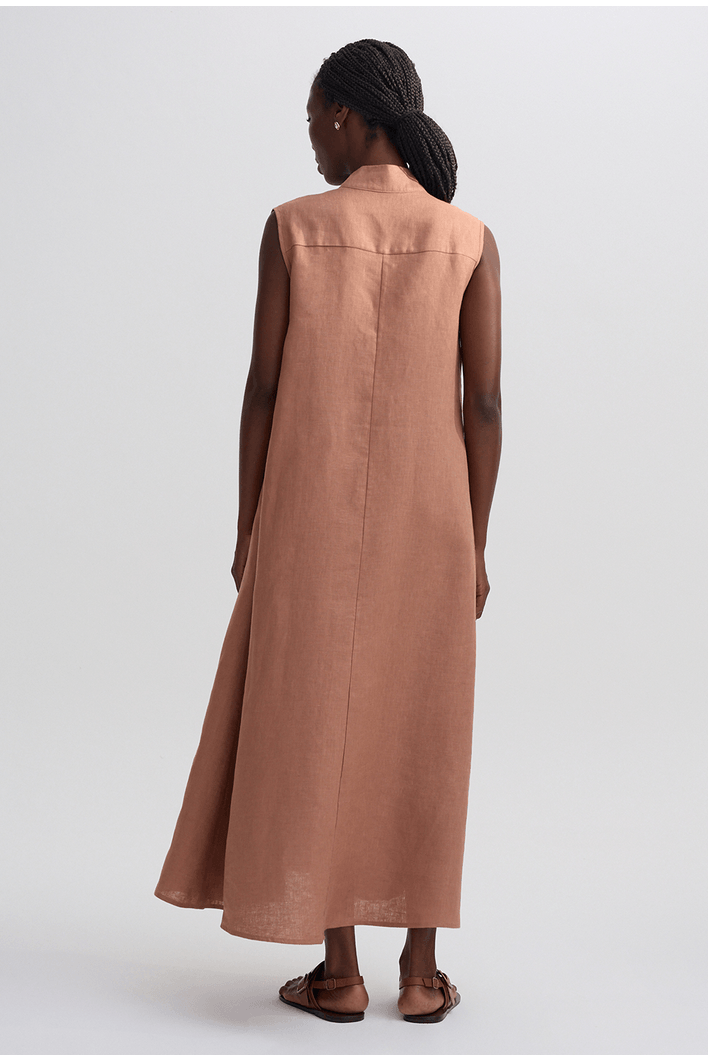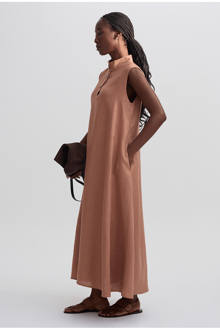 Vestido Reto em Linho Gola Padre Dominica Capuccino